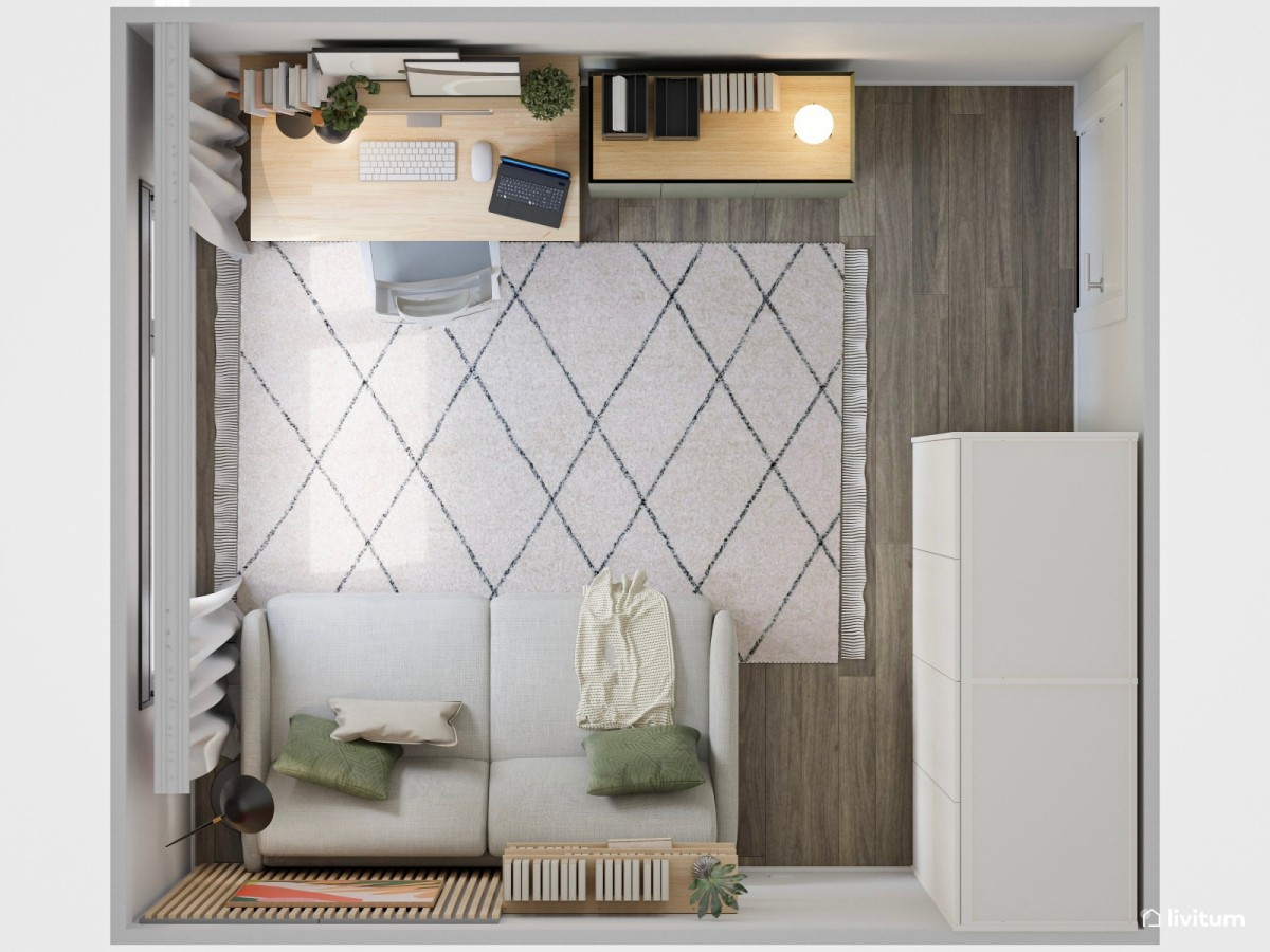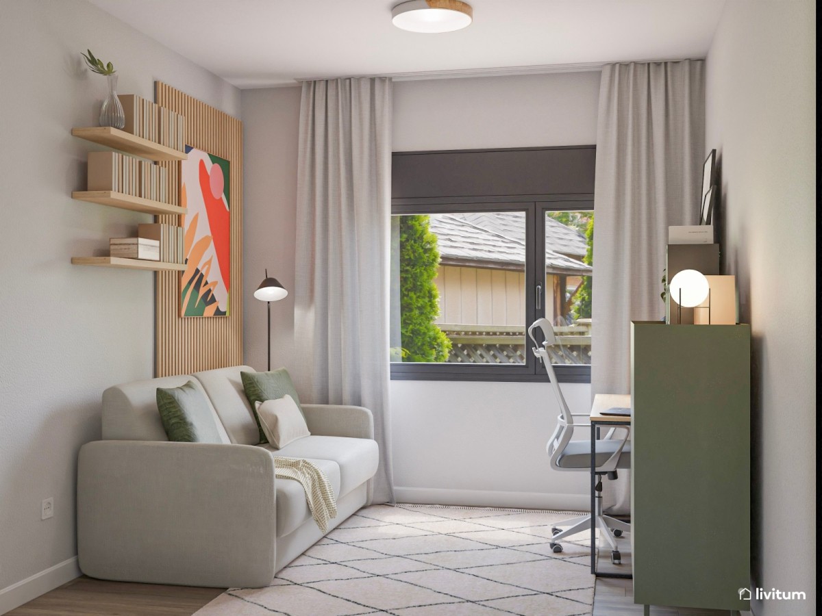 Esta estancia no solo brinda un espacio cómodo para estudiar o trabajar, sino que también permite descansar gracias al sofá blanco. ¡Es ideal para una tarde de lectura o para tomar una siesta exprés!