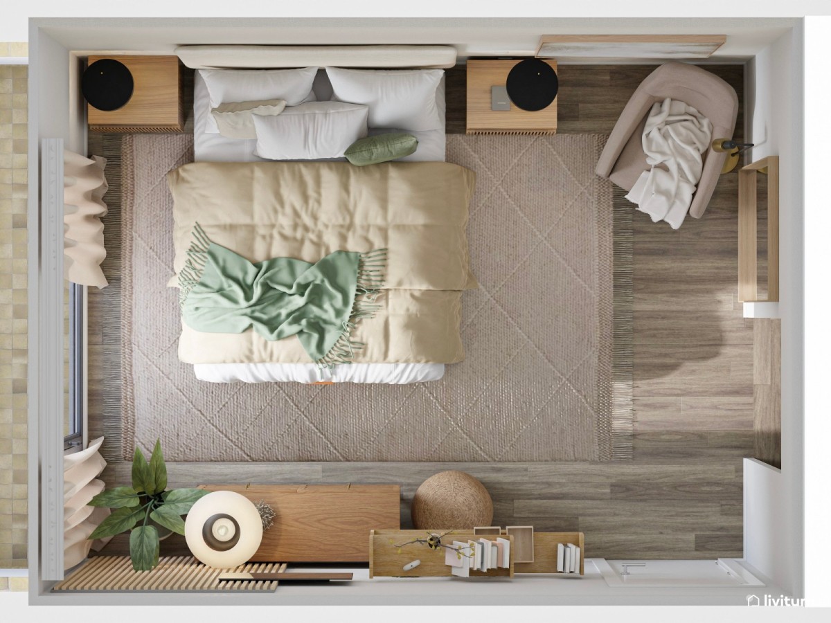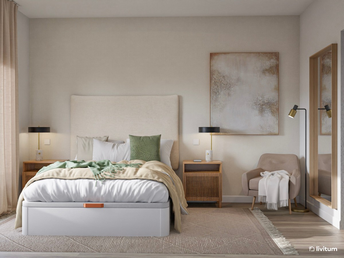 Si te gustan los tonos elegantes y neutros, pero con una pequeña dosis de color, este dormitorio es para ti. Fíjate en cómo predominan tonalidades como el beige, el negro, el blanco y suaves pinceladas de verde.