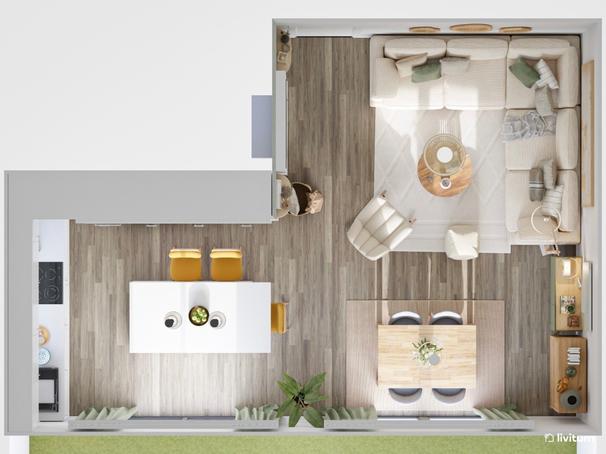 En tan solo 36 m², hemos conseguido crear una estancia diáfana, abierta y funcional. No solo se aprovechó el espacio para instalar una cómoda sala, sino que también se añadió un comedor abierto ideal para compartir en familia.