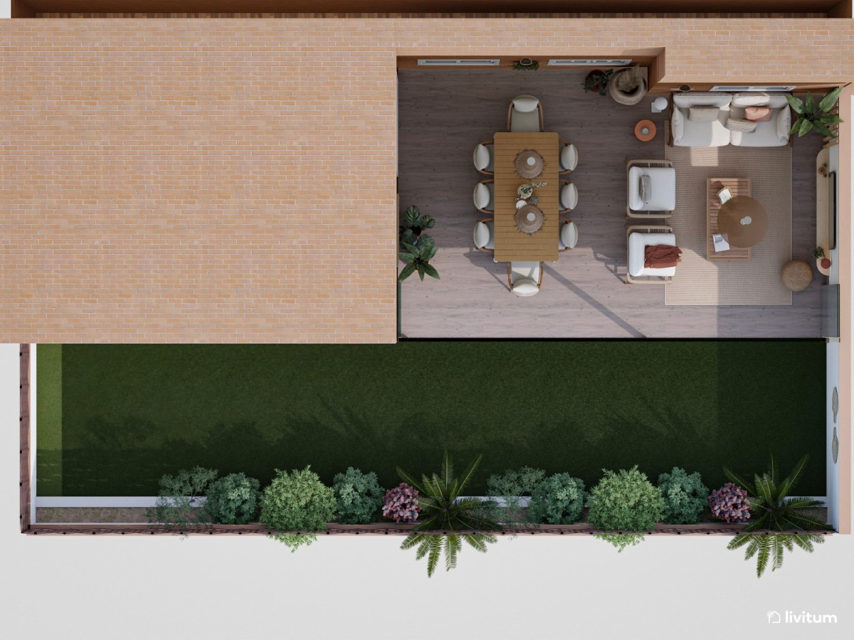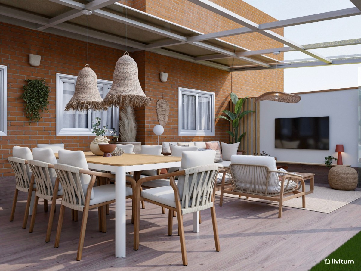 Este magnífico trabajo fue realizado por nuestra diseñadora Samanta Fernández, quien consiguió dotar de calidez a un entorno exterior para disfrutarlo como si fuera el salón de la casa: un comedor ideal para largas comidas con amigos, una zona de chill out para relajarse y hasta un rincón de cine para gozar de una maratón de películas o series. ¿Te animas a conocer este rincón tan especial?