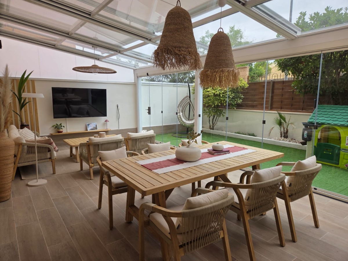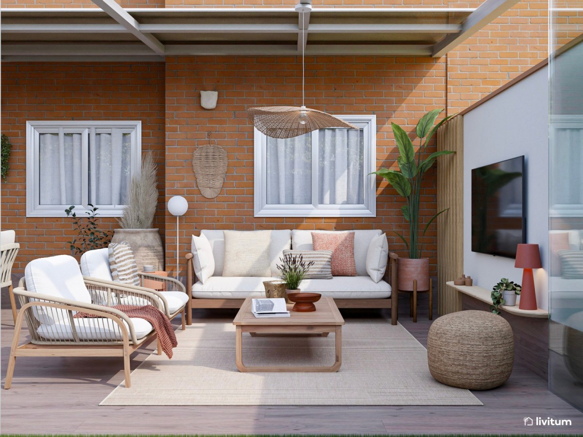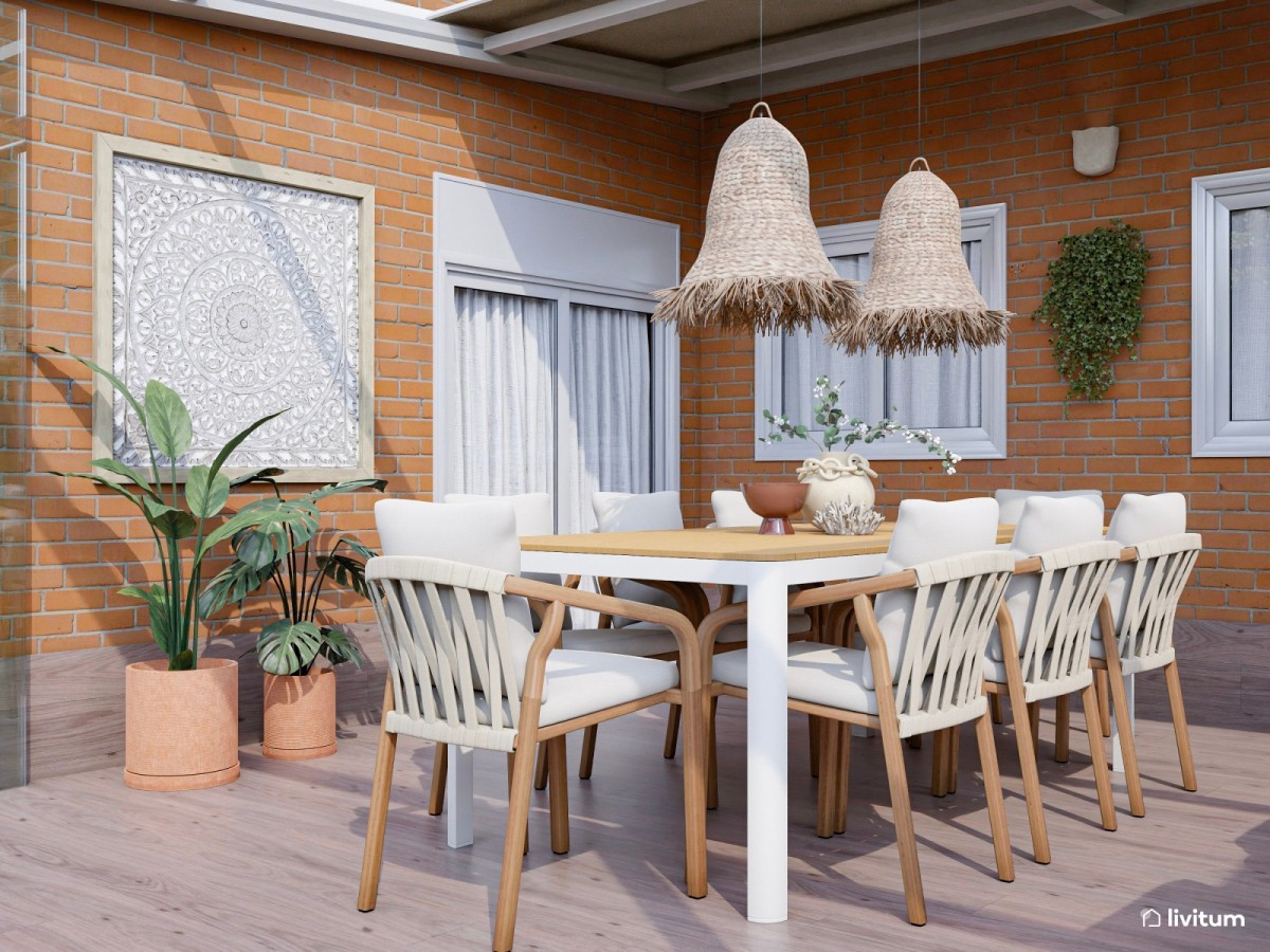 Tras la fase de diseño y la propuesta 3D, llegó el momento de ver el espacio terminado en la vivienda de nuestra clienta. El resultado no podría ser más satisfactorio: un porche luminoso, bien aprovechado y con una estética boho-rústica bien definida. Los toques en terracota, el uso de materiales naturales y los detalles tejidos quedan perfectamente combinados.