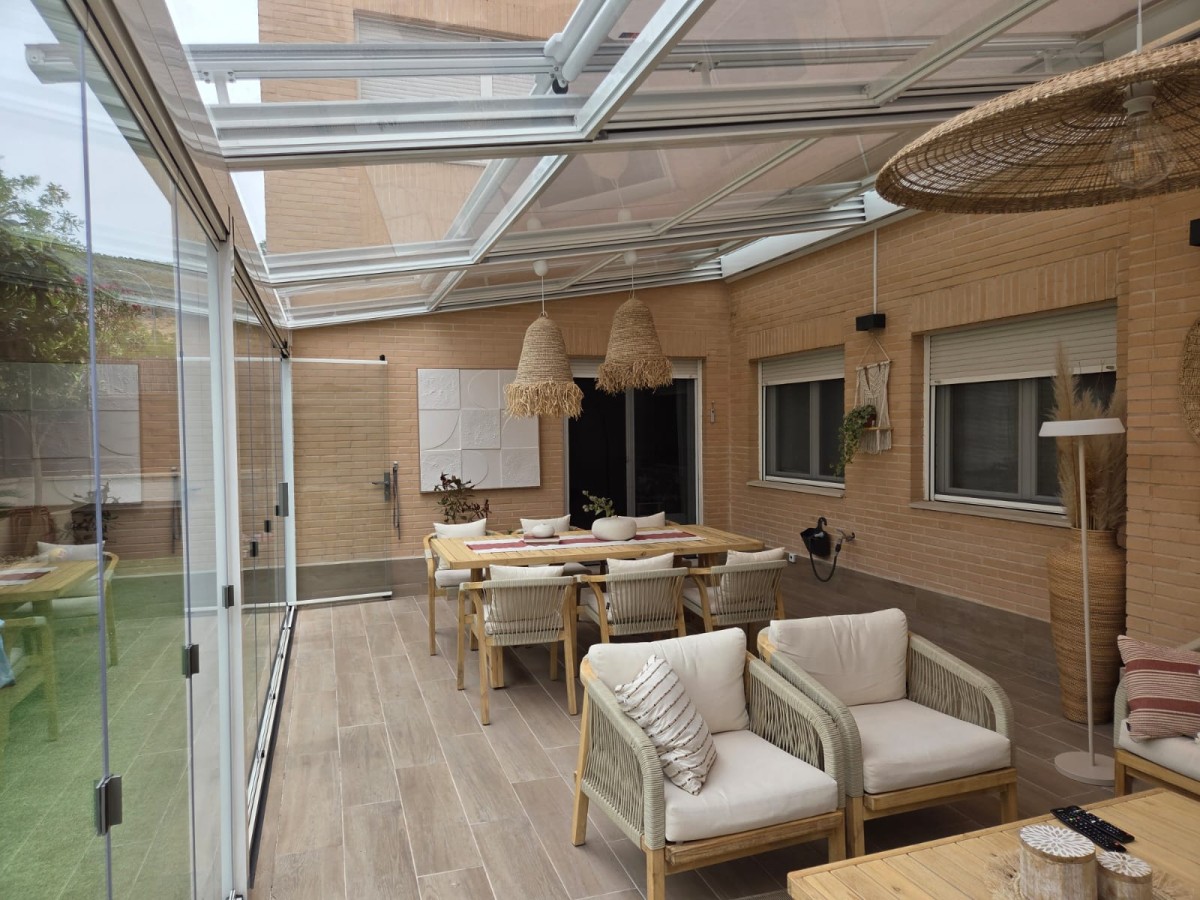 Las imágenes finales muestran cómo las piezas elegidas encajan a la perfección, desde el conjunto de sofás y sillones hasta el comedor exterior. La televisión se integra con naturalidad y convierte las veladas en un exquisito plan de cine en casa. Si te preguntabas cómo se protege la pantalla de la TV de las lluvias o del calor, ya puedes apreciar que el entorno se encuentra rodeado por un cerramiento acristalado. Una arquitectura perfecta para no desaprovechar ningún centímetro de este encantador porche.