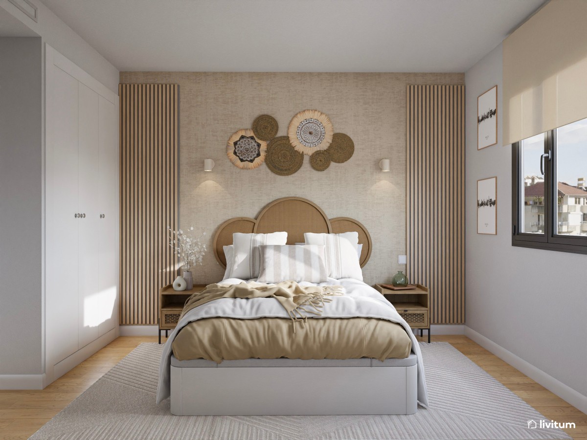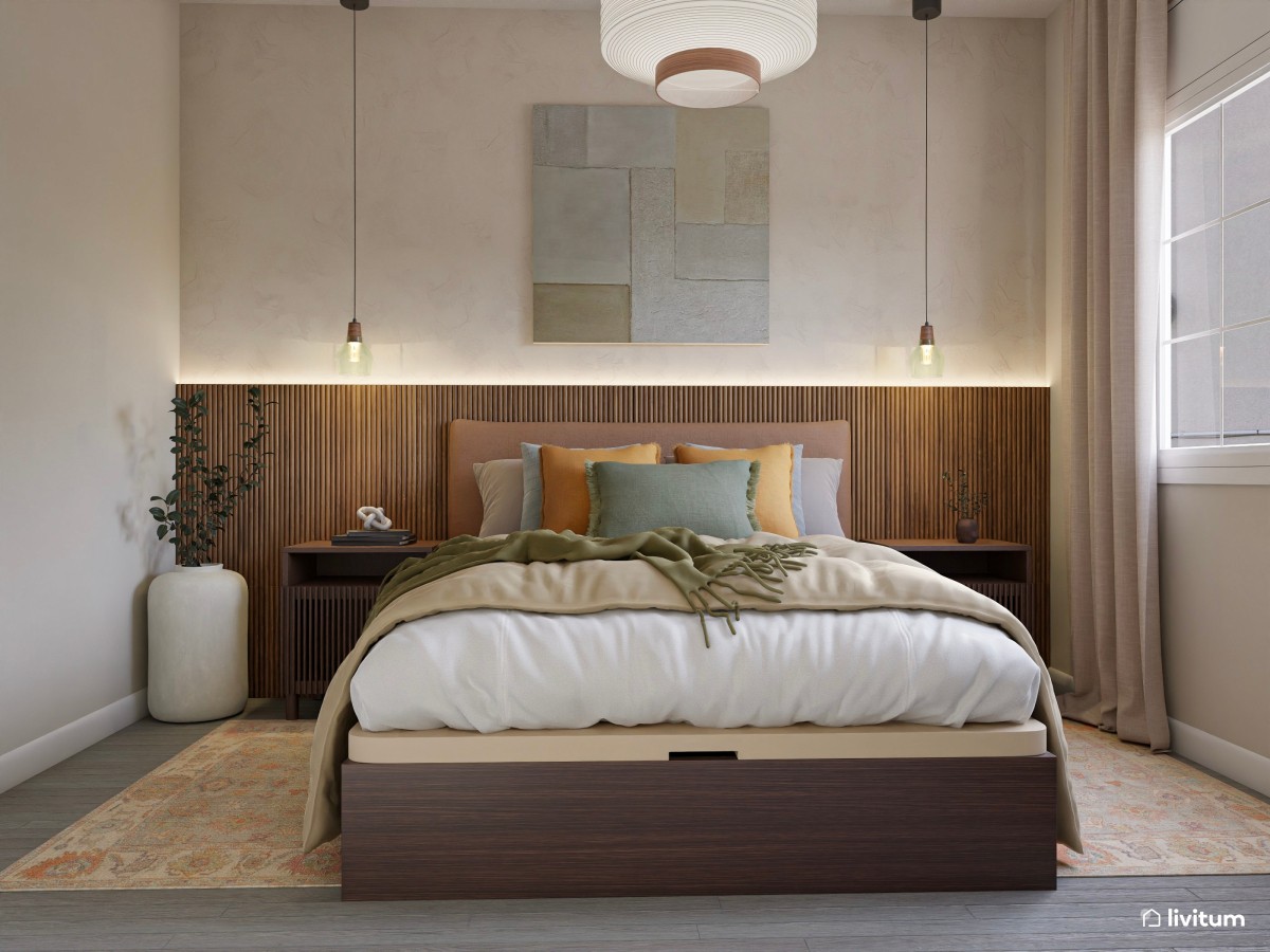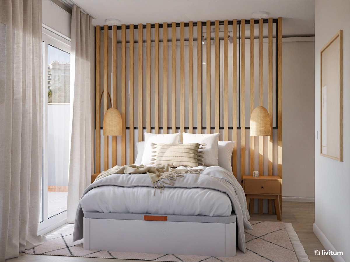 10. La opción de los listones de madera es tan versátil que puedes incorporarlos solo hasta media altura, a modo de cabecero, para darle al dormitorio esa tonalidad cálida que estás buscando, sin mucho esfuerzo y sin muchos colores.