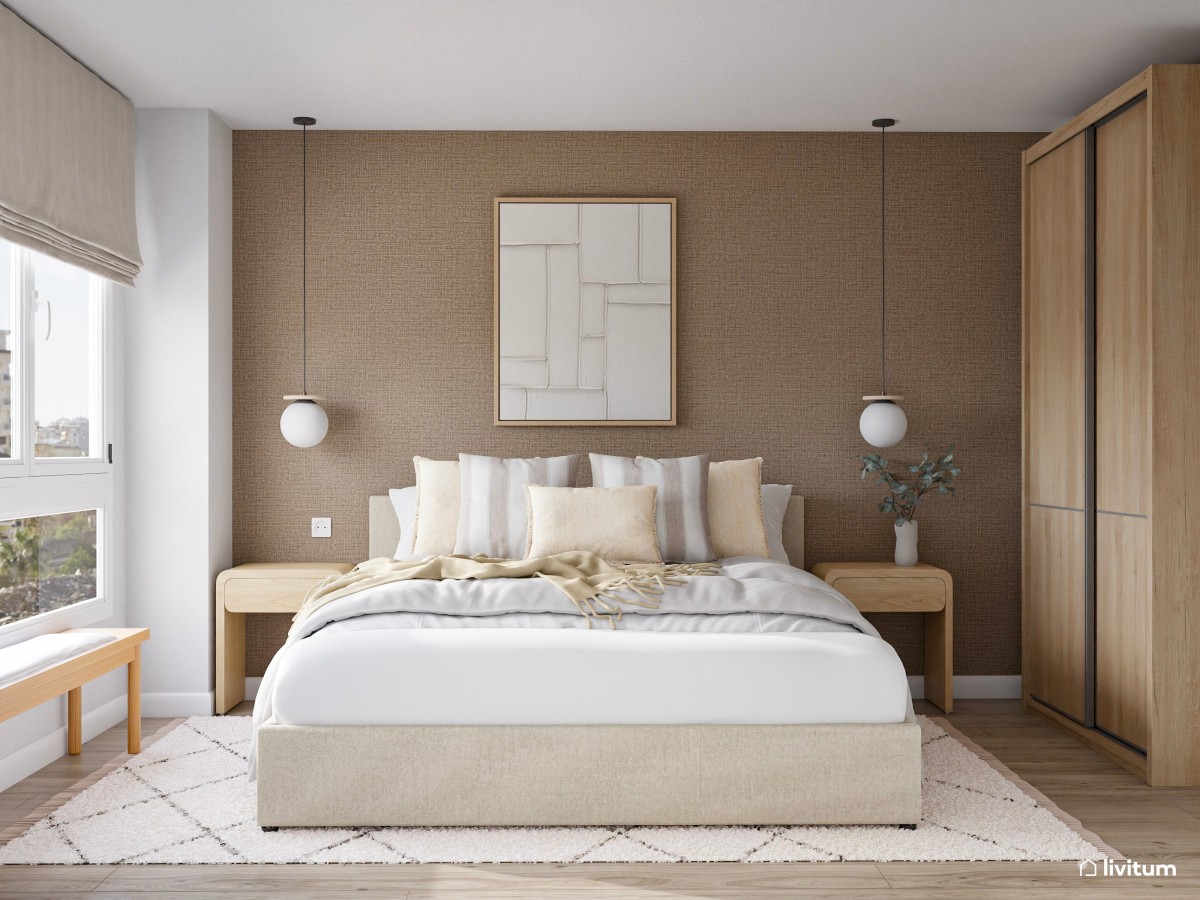 5. En este otro proyecto se ha combinado un marrón más oscuro para dar profundidad a la pared principal, con tonos tierra más claros, tanto en la ropa de cama como en el color natural de la madera de las mesillas de noche. ¿El resultado? Un espacio muy elegante que invita al descanso.