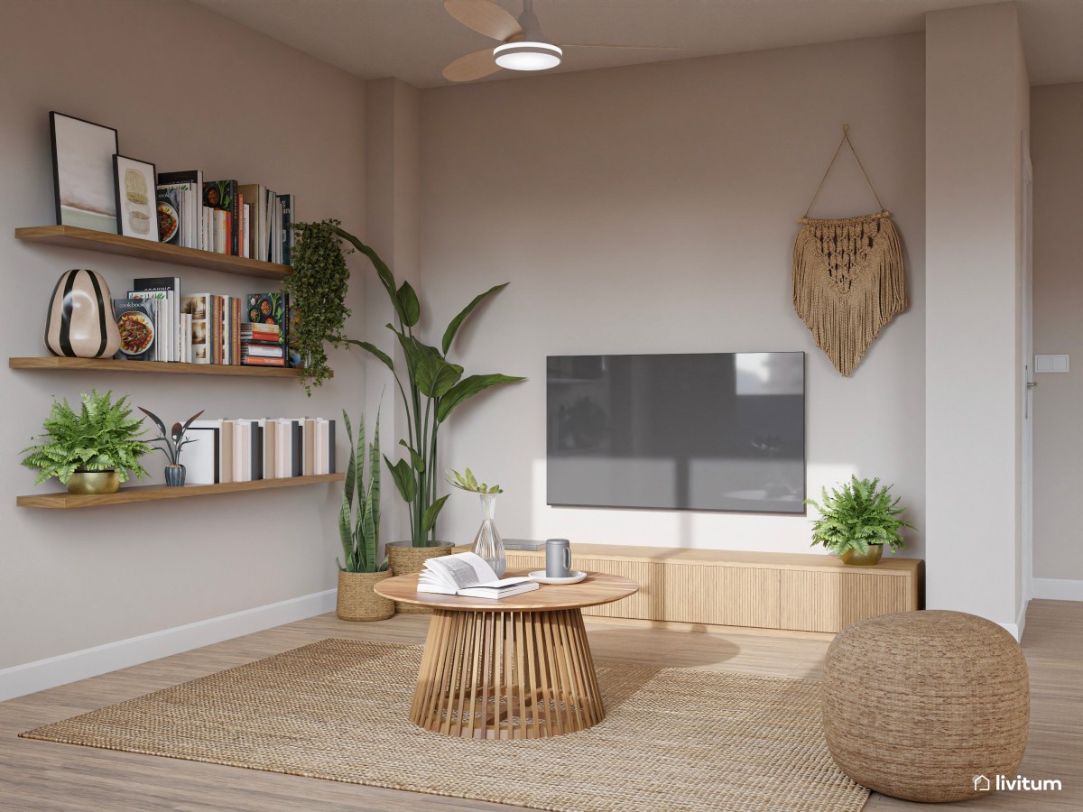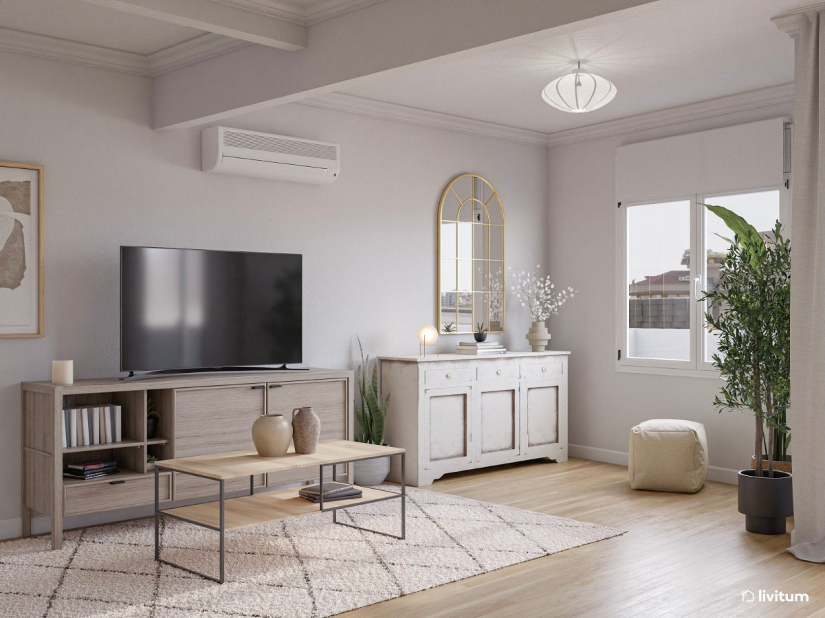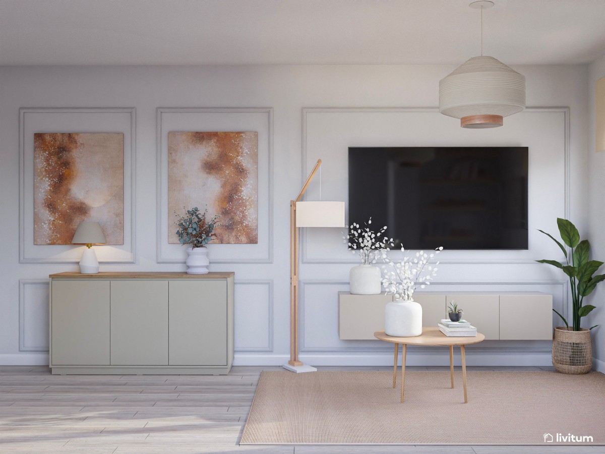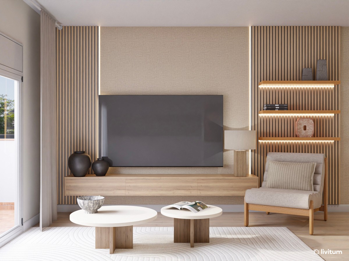 2. En un salón predominantemente de tonos claros cálidos, este mueble para TV de tono beige con detalle en madera es ideal. Conjunta con toda la decoración y aporta ese toque de calidez que una estancia tan clara necesita, a juego con unos bonitos listones de madera de la pared.