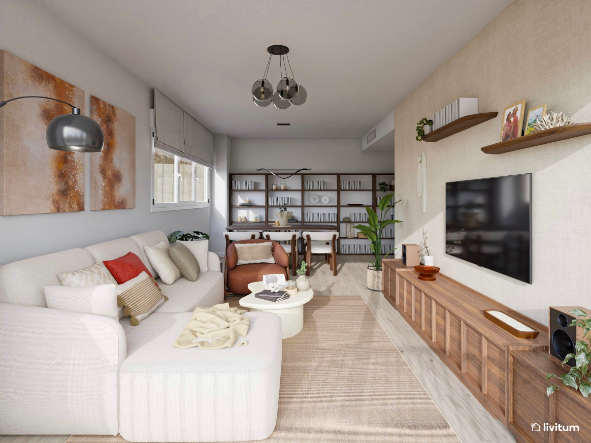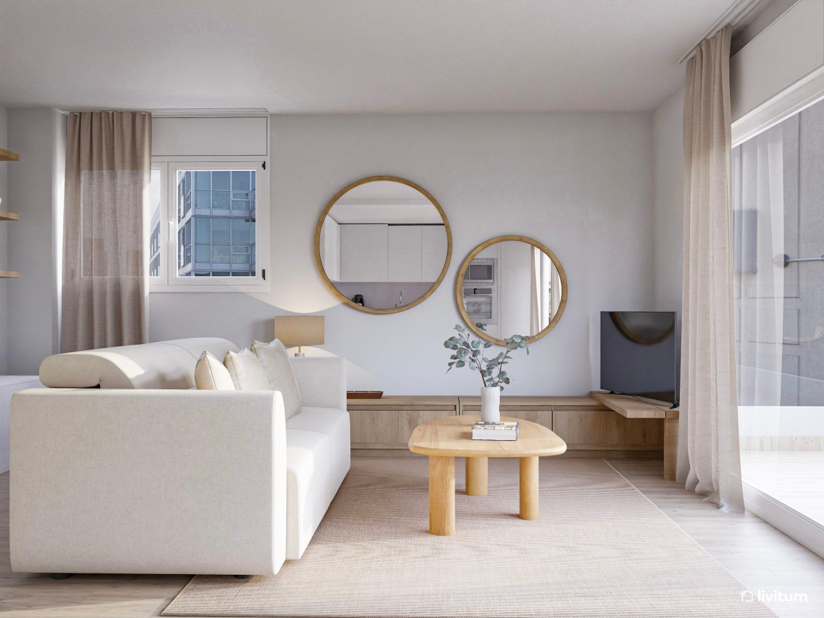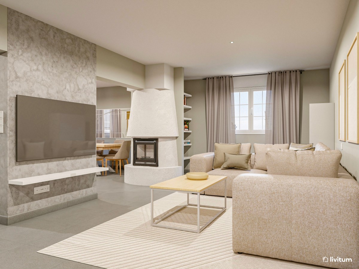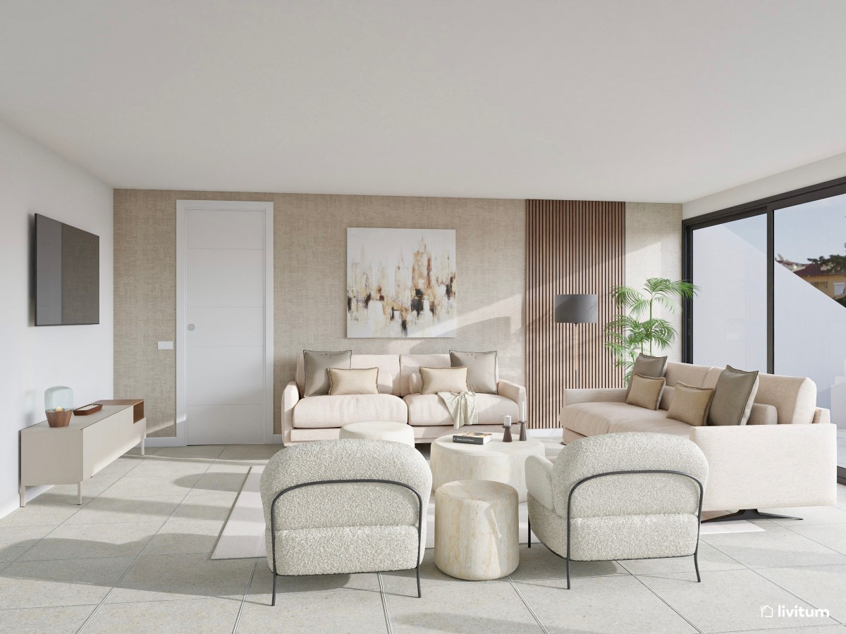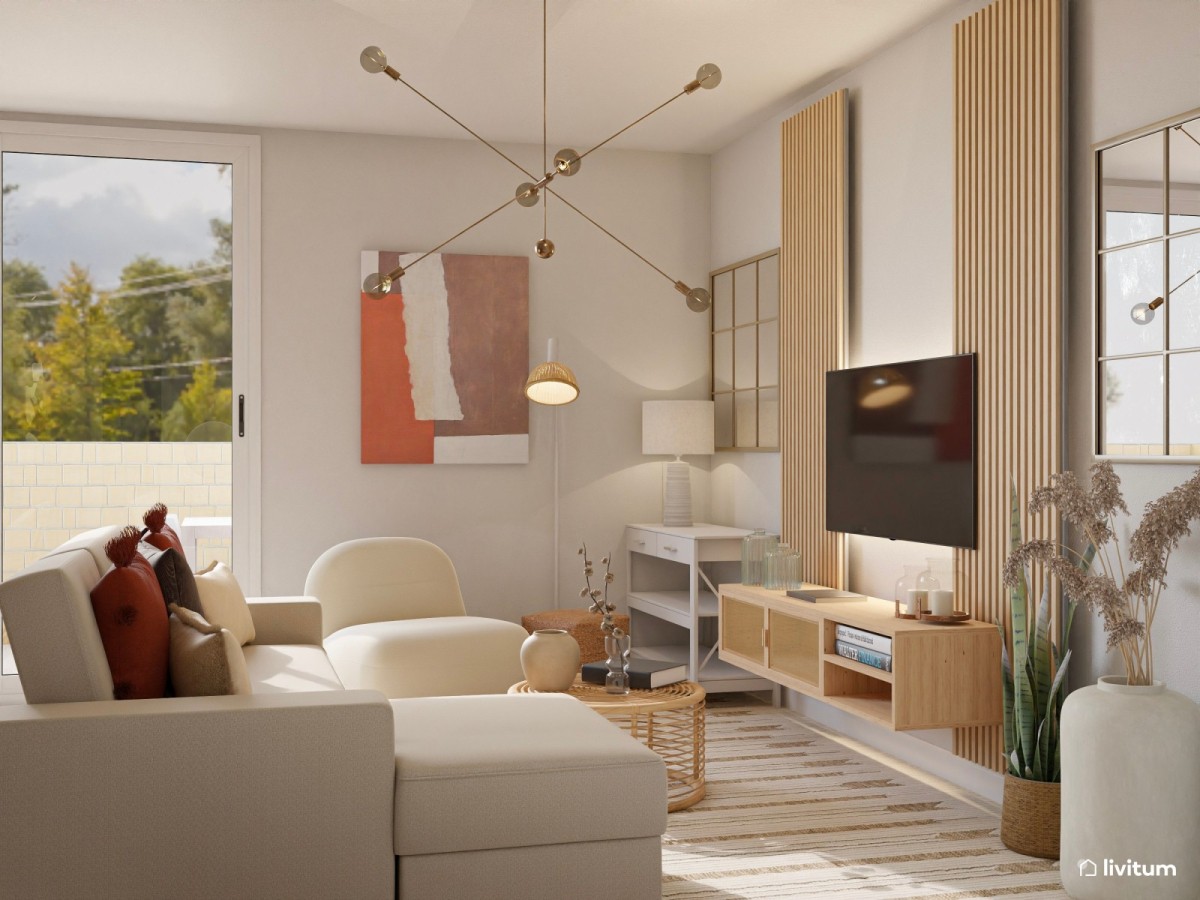 2. En un salón predominantemente de tonos claros cálidos, este mueble para TV de tono beige con detalle en madera es ideal. Conjunta con toda la decoración y aporta ese toque de calidez que una estancia tan clara necesita, a juego con unos bonitos listones de madera de la pared.