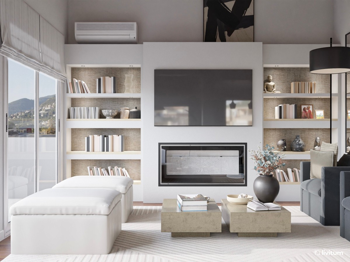 7. Si cuentas con una chimenea, aprovéchala. Coloca el televisor sobre ella y crea un mueble a su alrededor con mucho almacenaje. Para una mayor sensación de amplitud, apuesta por estanterías abiertas.