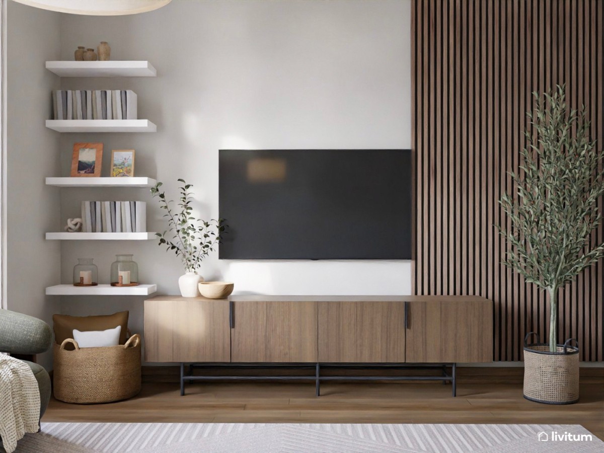 8. No basta con colocar un mueble del TV en la pared. Esa pared la debes decorar. Con unos bonitos listones de madera que, por ejemplo, enmarquen la zona del televisor, y de paso, la del mueble que la acompaña.