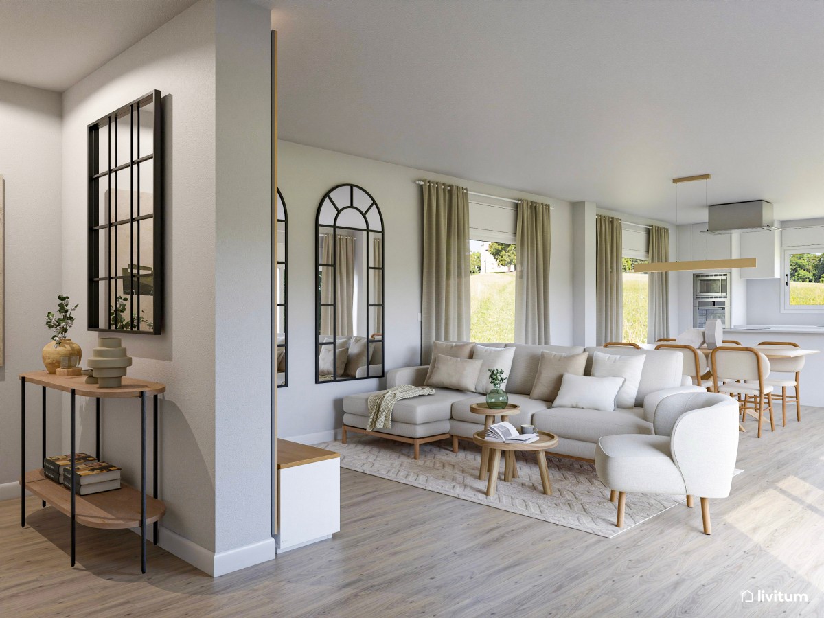 Nos fascina esta propuesta de Eva Pedro para un salón elegante y amplio. Aquí, la diseñadora apuesta por una base muy clara con materiales naturales y tapizados suaves. Los detalles en madera aportan esa clásica calidez nórdica, mientras que los grandes espejos de ventana en negro decoran y multiplican la luz natural. Un diseño acogedor, ordenado y con mucho estilo que se extiende hasta el comedor y el recibidor.
