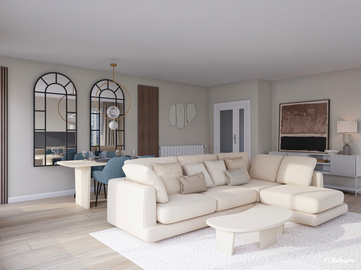 Este precioso salón de estilo moderno ha sido diseñado por Laura Álvarez. Se ubica en un privilegiado espacio con mucha luz natural. Para la propuesta, la diseñadora optó por una convivencia armónica de líneas geométricas con curvas suaves. La paleta en tonos crema y beige lo recorre de principio a fin, con detalles en verde turquesa y madera de roble que aportan carácter. Un espacio sofisticado donde la calidez y el orden visual van de la mano.