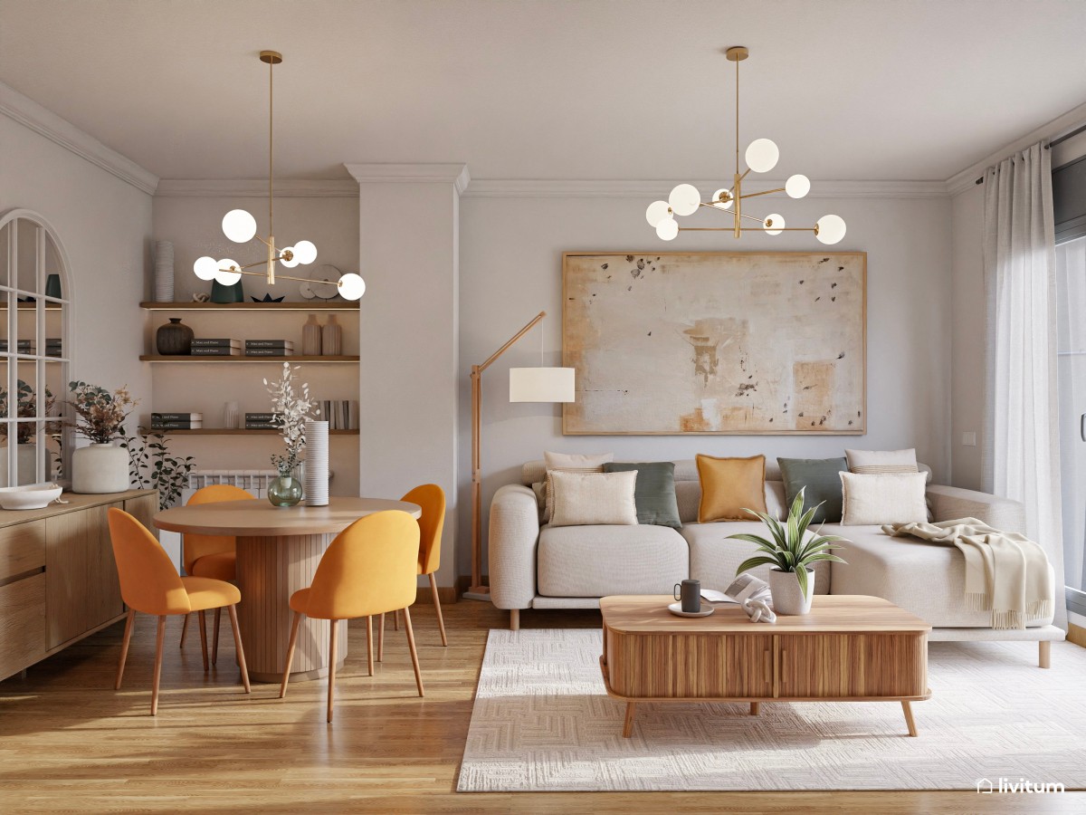 Laura Álvarez ha creado un salón donde los tonos cálidos, como naranja, beige y crema, son los absolutos protagonistas. La luz natural realza los detalles en madera y las luminarias esféricas, creando un ambiente lleno de vida y personalidad. Un espacio generoso, acogedor y visualmente coherente de principio a fin.