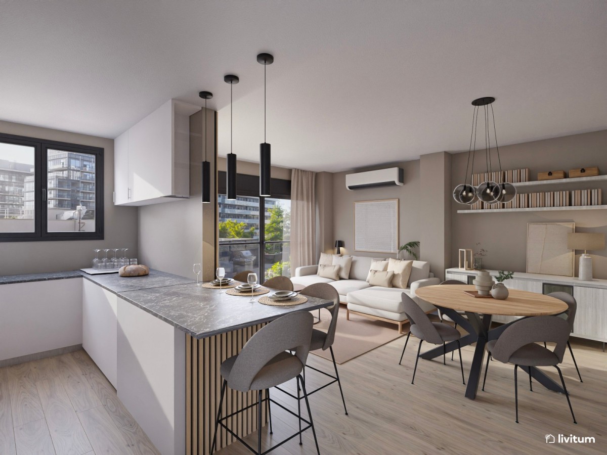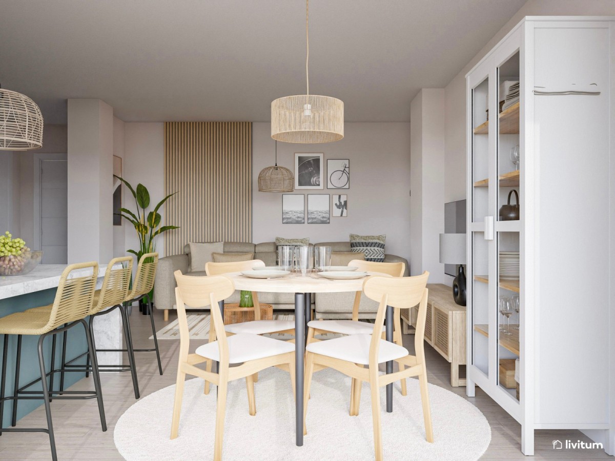 La atmósfera de paz y tranquilidad que transmite este salón comedor es innegable. Además de ofrecer un rincón de descanso y relajación, permite incorporar una cocina en forma de L para así conectar tres estancias en una sola. Este trabajo de la diseñadora Cristina Torres nos recuerda la importancia de los colores y texturas suaves en espacios pequeños: grises, blancos y maderas claras protagonizan la propuesta.