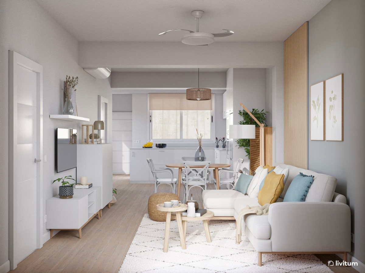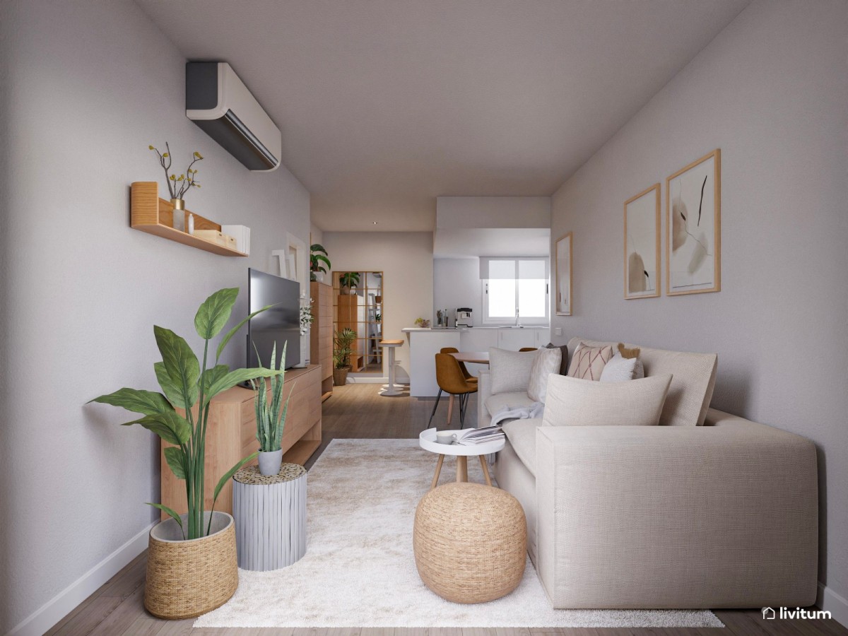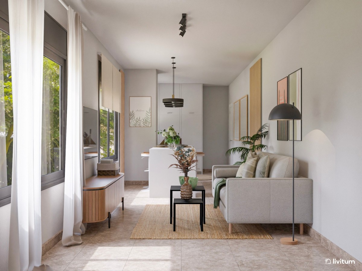 Este diseño de Maite Sousa nos recuerda que pequeño no es sinónimo de descuidado. Una sala de pocos metros cuadrados puede resultar ser un salón tremendamente cómodo y bien decorado. En este caso, la conformación alargada de la planta permite distribuir muy bien la zona de descanso, el comedor y la cocina al final del todo. Para ganar en personalidad y carácter, predominan las texturas acogedoras en la alfombra, las fibras tejidas y los muebles de madera natural.