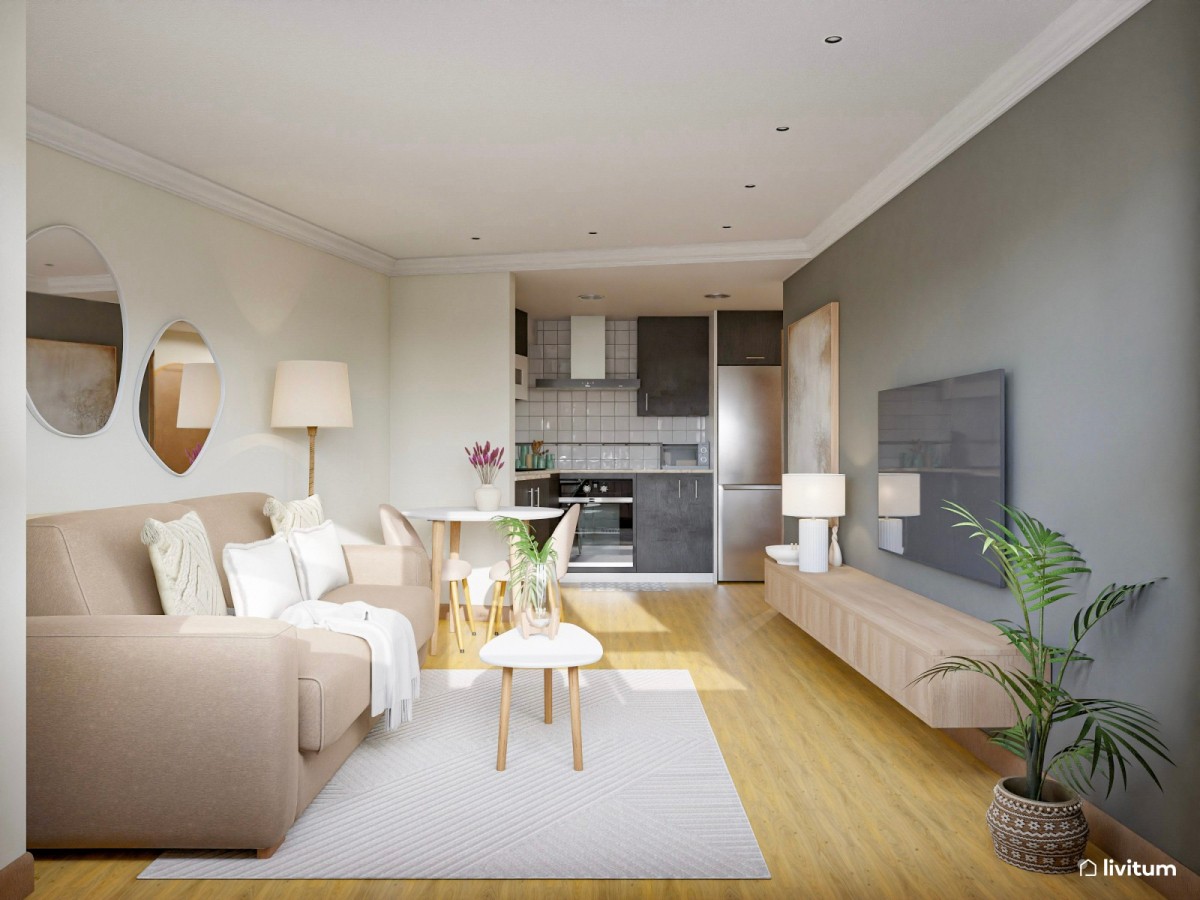 Este bonito salón con cocina y comedor es un trabajo de la diseñadora Patricia Ruiz. En él, se aprovechó la conformación irregular de la planta para añadir un pequeño recibidor. Destaca la pared de acento en gris verdoso y la presencia de elementos frescos y naturales como plantas o muebles de madera lacada en blanco. Para el sofá, optamos por un modelo en color arena suave, ideal para añadir un toque de calidez extra al ambiente.