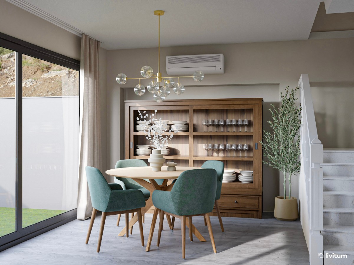 La luz de esta lámpara tejida envuelve el comedor con un aire fresco y relajado. Combina a la perfección con los tonos amaderados, los toques turquesas y las plantas del ambiente. Como resultado, nos encontramos ante un comedor sereno y moderno, ideal para comidas entre amigos o familiares.