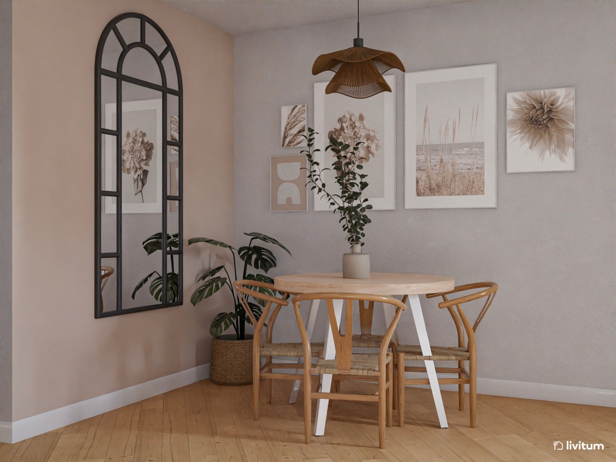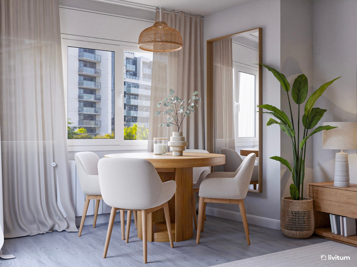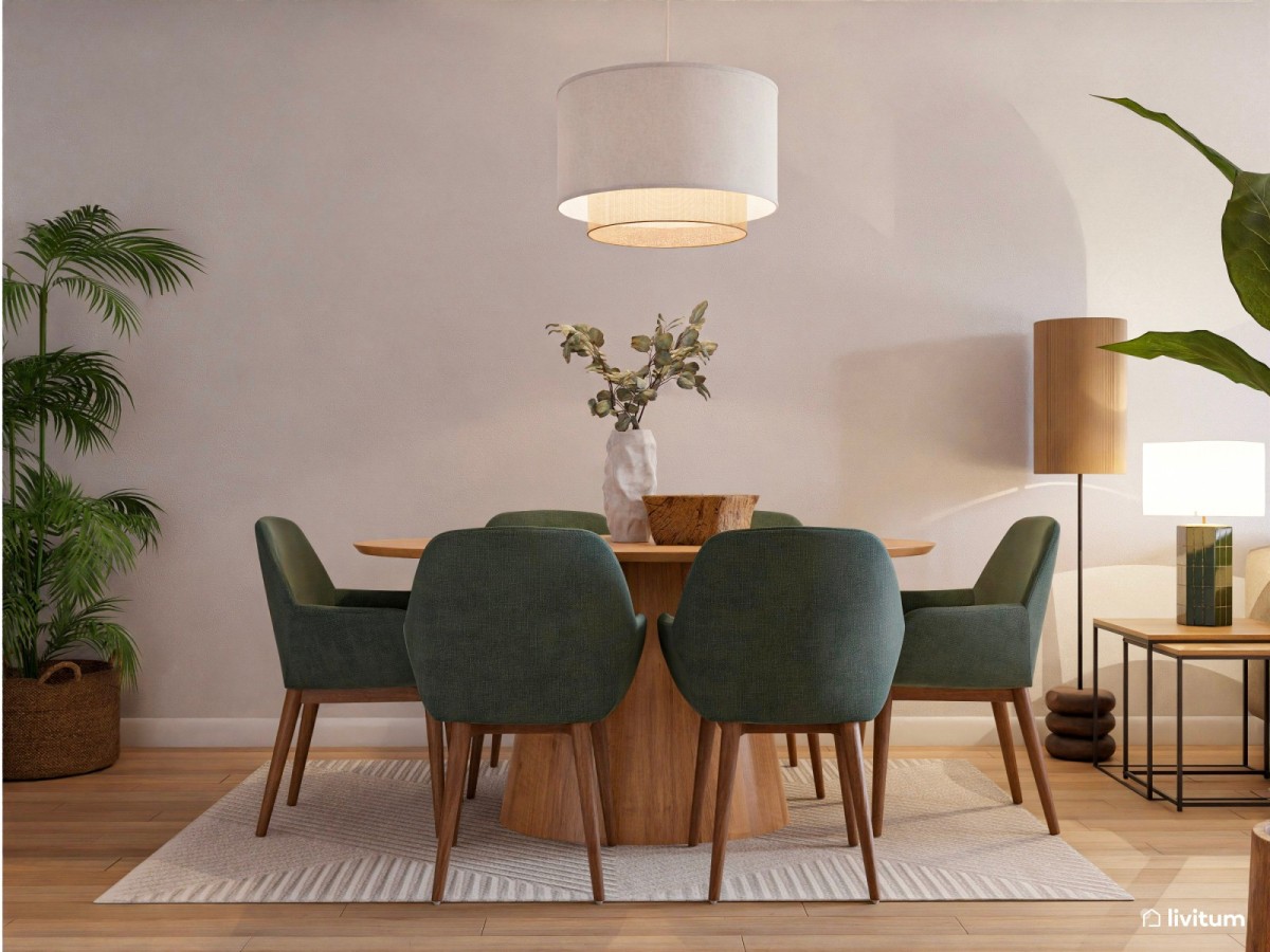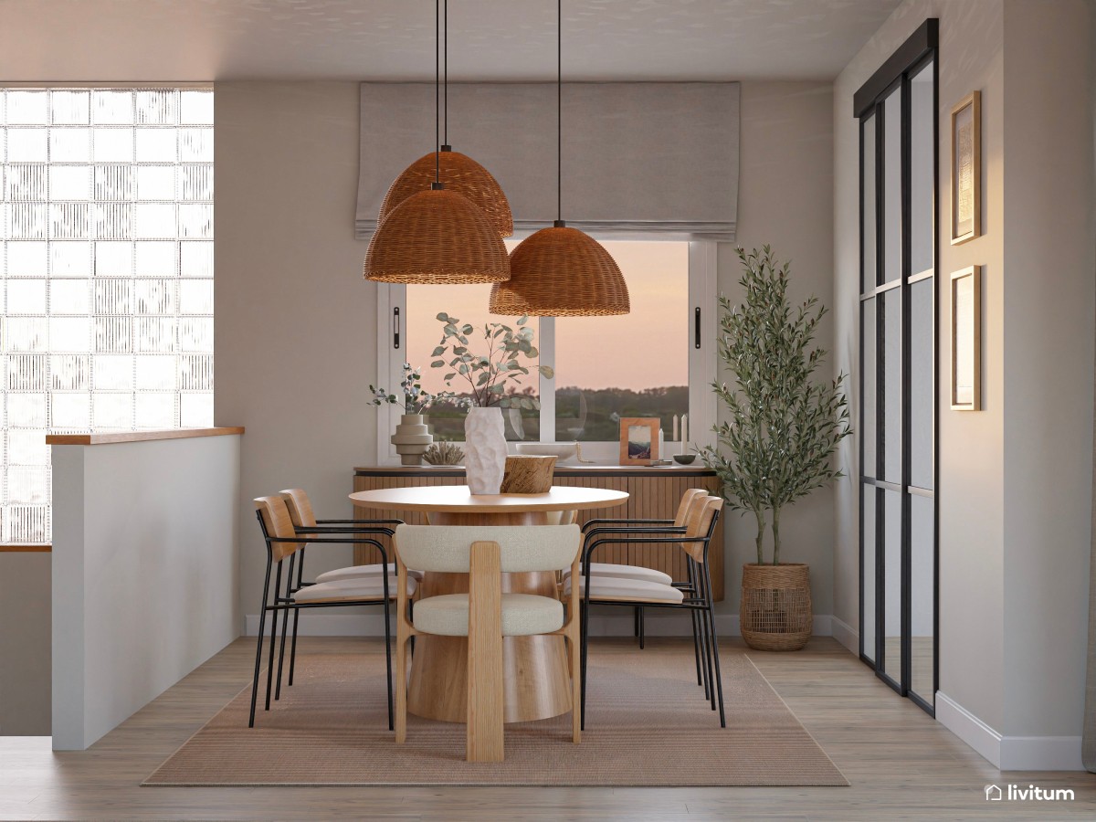 En este comedor de estilo natural y nórdico, la lámpara es clave para crear una atmósfera íntima y acogedora. En este caso, se escogió un modelo que combina bambú con tela, una mezcla ideal para hogares donde reina la calidez.