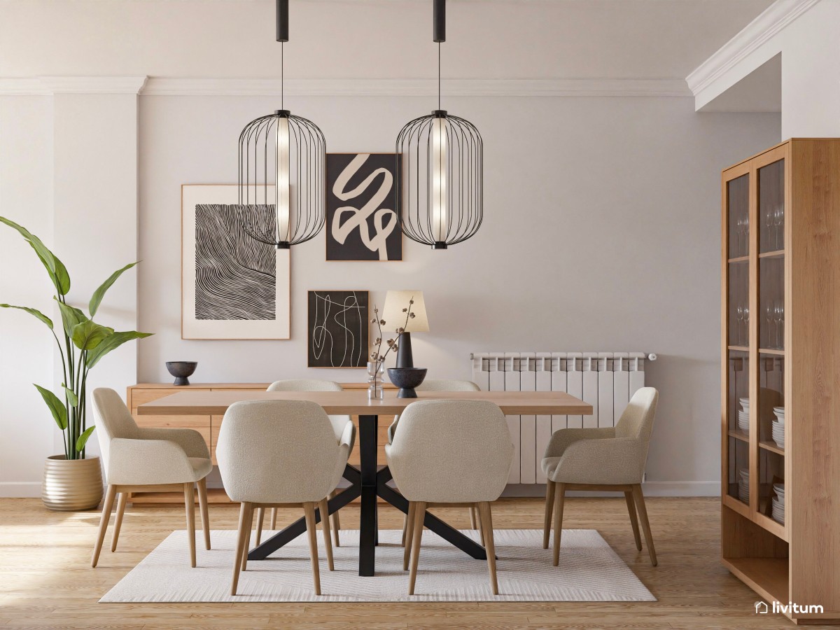 En este comedor, las lámparas negras destacan por su diseño de líneas limpias y materiales contrastantes. El negro mate del metal dialoga con la calidez de la madera y los tonos neutros del mobiliario, aportando equilibrio y modernidad al espacio.