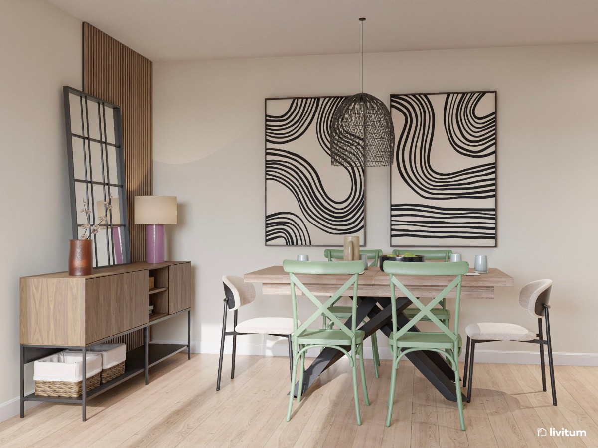 Sin embargo, aquí también intervienen otro tipo de factores. Por ejemplo, si se trata de una mesa con mucha personalidad o mucha presencia por su tamaño, y quieres convertirla en la pieza central de la estancia, es bueno que respire más de la cuenta y dejar más espacio entre ella y la pared. Por el contrario, si es una mesa sencilla y ligera, no es necesario que respire tanto.